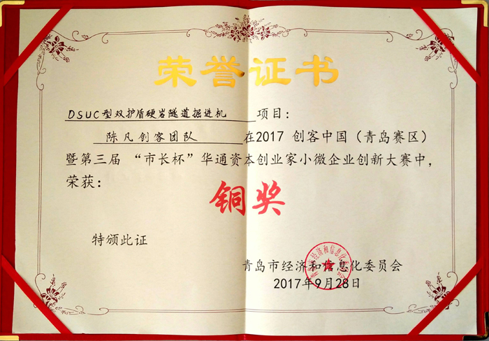 9月28日,2017創(chuàng)客中國(guó)(青島賽區(qū))暨第三屆“市長(zhǎng)杯”華通資本創(chuàng)業(yè)家小微企業(yè)創(chuàng)新大賽決賽在海爾全球創(chuàng)新模式研究中心開(kāi)賽,15個(gè)優(yōu)秀創(chuàng)新項(xiàng)目上演了“尖峰對(duì)決”和終極PK,最終,中船重工(青島)軌道交通裝備有限公司-陳凡創(chuàng)客團(tuán)隊(duì)的參賽項(xiàng)目“DSUC型雙護(hù)盾硬巖隧道掘進(jìn)機(jī)”以總決賽第三名的優(yōu)異成績(jī)獲得大賽銅獎(jiǎng)。國(guó)家工信部中小企業(yè)局等領(lǐng)導(dǎo)為獲獎(jiǎng)項(xiàng)目頒發(fā)了獎(jiǎng)杯和證書(shū)。