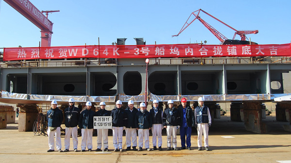 2018年12月28日上午,公司承接的出口項(xiàng)目?C?C6.4萬載重噸木屑運(yùn)輸船3號(hào)、4號(hào)船,在2號(hào)造船塢內(nèi)先后實(shí)現(xiàn)合攏鋪底。至此,公司承建的4艘6.4萬載重噸木屑運(yùn)輸船已全部按照生產(chǎn)節(jié)點(diǎn)計(jì)劃順利推進(jìn)。公司副總經(jīng)理周向陽和船東代表及相關(guān)監(jiān)造人員、驗(yàn)船師,NK船級(jí)社代表以及公司相關(guān)部門負(fù)責(zé)人出席了鋪底儀式。