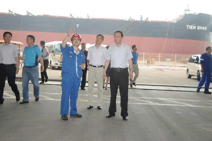 在修船碼頭、聯合廠房、造船大塢,王國海 向來訪客人介紹了海西灣造修船基地的規劃選址,以及在船舶市場持續低迷大環境下逆勢發展的相關情況。考察組一行對北船重工良好的區位發展優勢和取得的令人矚目的業績表示欽佩。