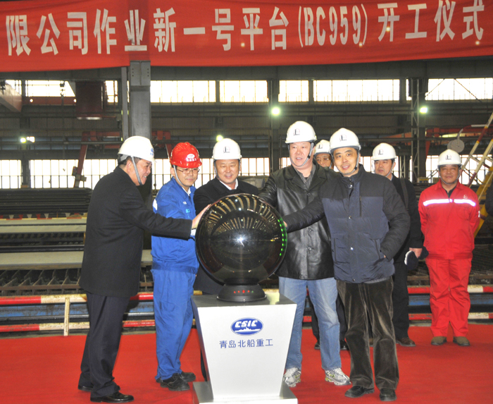 公司近兩年來在開拓海工市場上的重要項目?C?C為中石化勝利石油工程有限公司建造的“作業新一號平臺”于12月18日下午在公司船體聯合加工廠房舉行了開工儀式。公司總經理助理于寶月主持開工儀式并下達開工令,公司副總經理劉杰與船東、CCS船級社、設計單位代表等共同按啟切割機開機觸摸球,平臺正式開工建造。