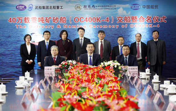 4號船交船暨命名儀式在公司造船2碼頭舉行。武船集團黨委委員、公司董事長韓兵主持儀式,武船集團副總經理王渭齡和招商局能源運輸股份有限公司總經理王永新先后在儀式上致辭。