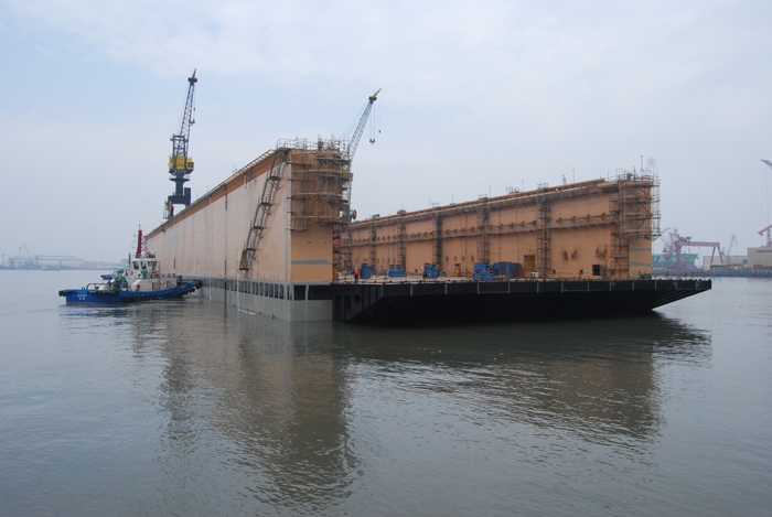 4月20日上午,公司為美國BAE公司建造的55000長噸舉力浮船塢(FDD55K-1),在順利完成船體建造工程后離開1號造船塢靠泊造船3號碼頭。該浮船塢由美國ABS船級社負責監造,工藝標準要求嚴,施工難度大,其工期直接影響到公司造修船生產資源結合平衡的總體計劃。為此,公司各相關部門高度重視,按照節點計劃落實細節,確保各個生產節點按計劃完成。該浮船塢靠泊碼頭后,將進行艙室涂裝、系統安裝調試等工作,計劃5月中旬進塢完成船體噴漆等工程,7月份完成出海沉浮試驗,8月份交船。