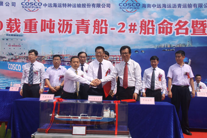7月5日,中船重工武船集團新北船基地順利舉行13000噸瀝青船2號船?C“金州灣”命名暨交接儀式。中遠海運特運公司副總經理李建雄,中遠國際船舶貿易(北京)有限公司副總經理張巖;海南中遠海運瀝青運輸有限公司總經理譚力,黨委書記陳昆等領導及社會各界嘉賓參加儀式,武船集團董事長楊志鋼出席儀式并剪彩,武船集團北船重工總經理韓兵致辭。