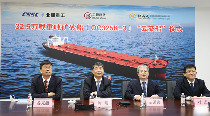 6月24日,公司為工銀租賃和招商輪船建造的32.5萬噸礦砂船“ORE SHANTOU”順利交付,這是繼公司2月份交付1號船、4月份交付2號船后再次交付的第三艘同型船舶。本次“云交船”儀式在北京、香港、武漢、青島4城5地同步舉辦,中國船舶集團副總經理孫偉、招商輪船董事長謝春林、工銀租賃總裁趙桂才、武船集團董事長陳?較群籩麓牽?工銀租賃航運金融事業部執行總經理郭芳萌、公司總經理谷克超代表雙方簽署了交船議定書,公司董事長王國海主持儀式。