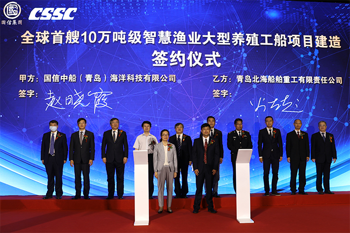 中國船舶集團有限公司黨組成員、副總經理孫偉,青島市副市長耿濤,青島國信集團黨委書記、董事長王建輝,中國水科院首席科學家、漁機所所長徐皓,中國船級社副總裁鐘小金,國家農業農村部漁業漁政管理局養殖處處長陳家勇出席簽約儀式并先后致辭。中國船舶集團有限公司船海部主任王永良,武船集團黨委書記、董事長陳埥,公司黨委書記、董事長王國海及青島市政府有關部門負責人參加了此次活動。
