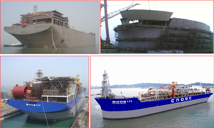10萬噸級FPSO”海洋石油115“,該船長232.5米,型寬46米,型深24.1米。