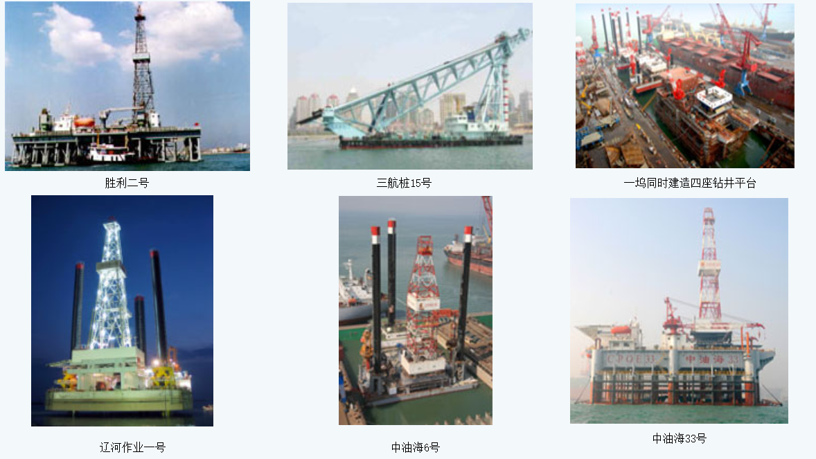 公司自1981年開(kāi)始承接海洋鉆井平臺(tái)和工程船的修理、改裝和建造工程,曾對(duì)“渤海四號(hào)”、“勘探二號(hào)”、“渤海六號(hào)”、“渤海十號(hào)”、“勝利一號(hào)”等海洋石油鉆井平臺(tái)進(jìn)行過(guò)修理或改裝,建造了“勝利二號(hào)”、“埕島中心一號(hào)”、“勝利作業(yè)三號(hào)”、“遼河作業(yè)一號(hào)”等海洋平臺(tái)和“三航樁15號(hào)”、 “粵工樁8”等工程船舶。公司遷址海西灣以來(lái),在新廠址上已建造交付了“試采3號(hào)”、“中油海5”、“中油海6”等7座鉆井平臺(tái)。